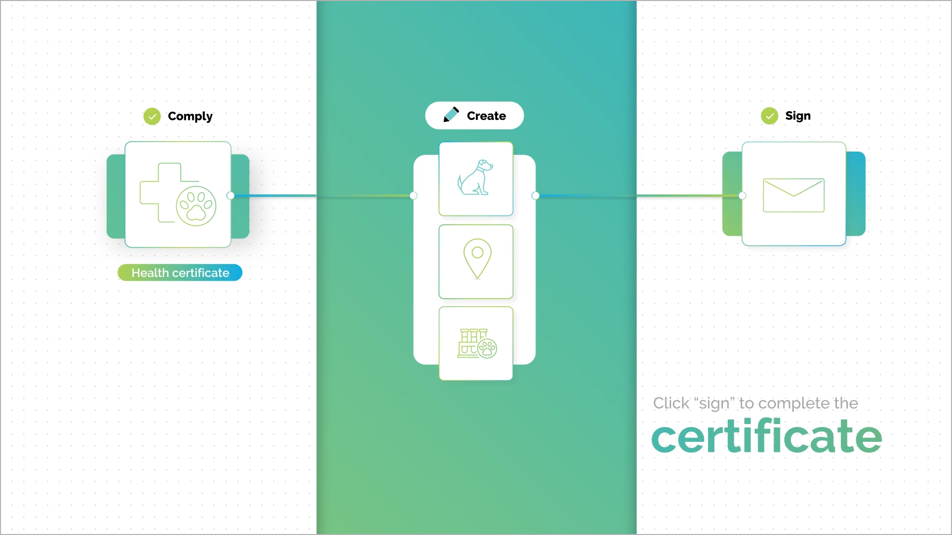 To express how simple the platform makes compliance, our team focused on creating a design approach that feels simple and clean. The simple white backgrounds and thin line illustrations give the video both a clinical and approachable feel. Each step in the process was designed to feel clear and connected. All of this is balanced with lifestyle footage of vets doing what they love rather than dealing with paperwork.